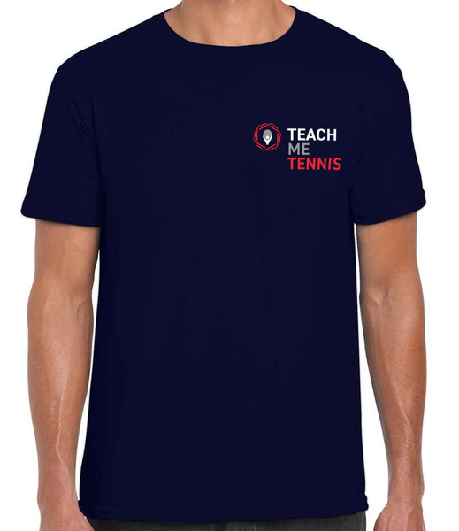 Teach Me Tennis logo printed on the left chest and on the back of the t-shirt.